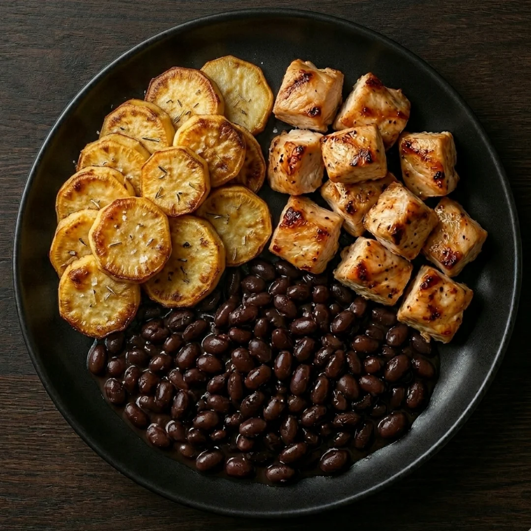 Frango grelhado suculento, batata-doce assada no ponto certo e feijão caseiro temperado do jeito que a gente gosta. Um prato simples, honesto e cheio de nutrição — proteína de qualidade, carboidrato de baixo índice glicêmico e fibras que saciam de verdade. Conforto sem culpa no prato.