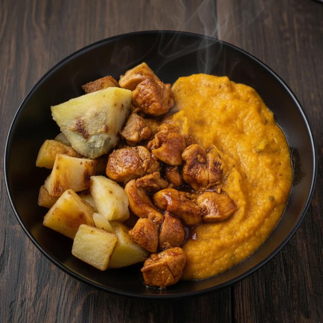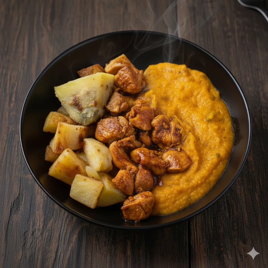 Batata doce assada, frango teriyaki suculento e purê de moranga cremoso — uma combinação perfeita pra quem quer comer bem sem sair da dieta. 💪