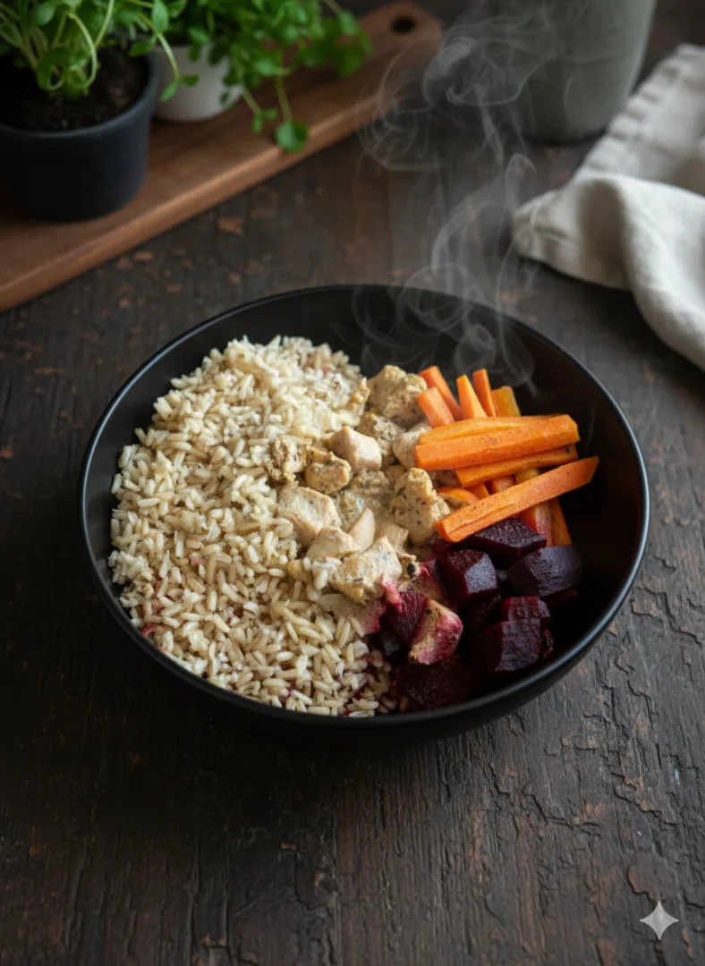 Frango grelhado suculento, arroz integral soltinho e aquele toque adocicado da beterraba com a crocância leve da cenoura. Uma explosão de sabor e leveza que dá água na boca só de olhar!