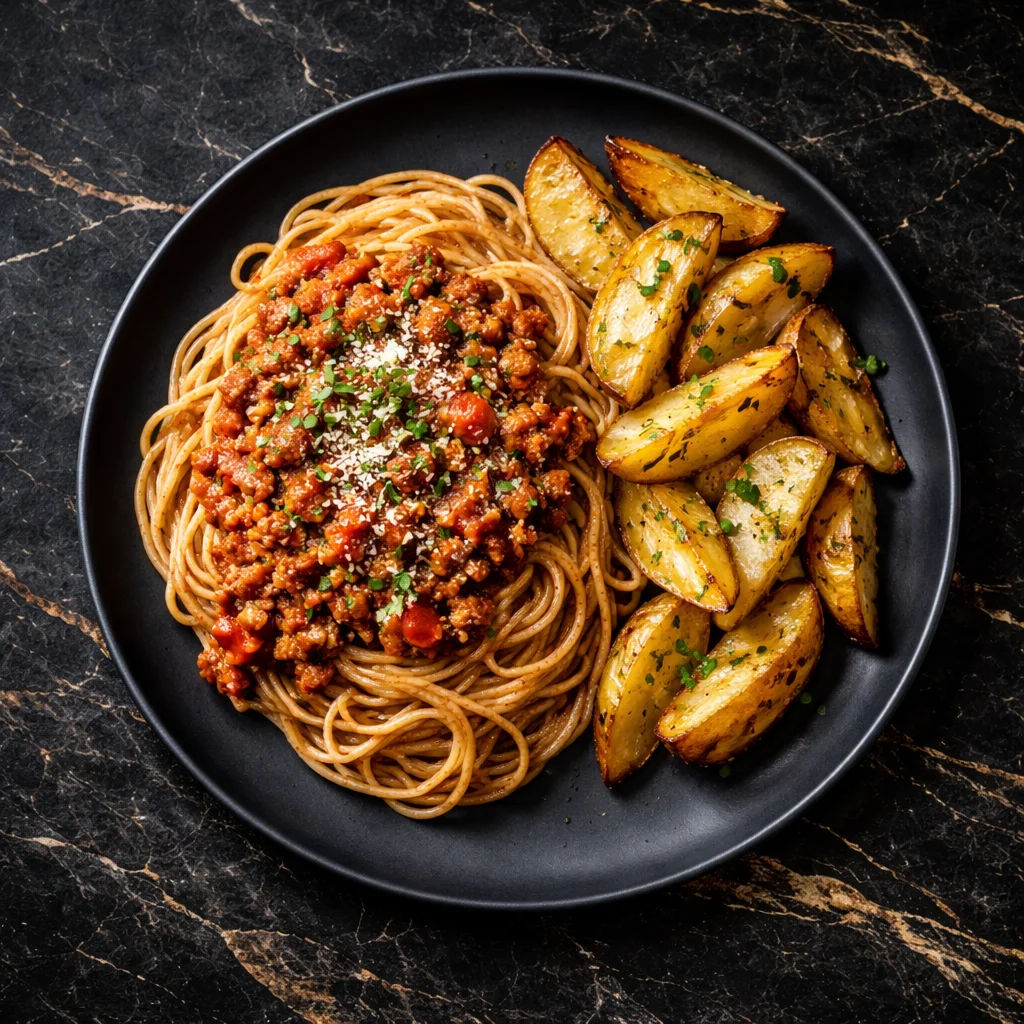 Massa integral leve e nutritiva, envolvida em um molho bolonhesa caseiro, rico em sabor e feito com carne selecionada. Acompanha batatas rústicas douradas por fora e macias por dentro, trazendo o equilíbrio perfeito entre conforto e praticidade.
