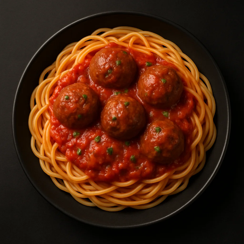 1x P6 - Spaghetti ao molho sugo com almôndegas.