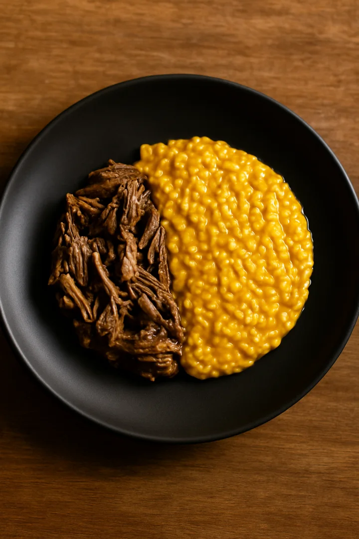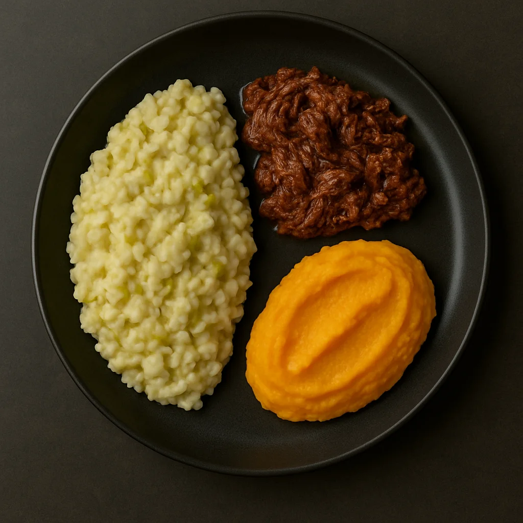 2x L4 - Risoto de alho poró com ragu de carne e purê de moranga