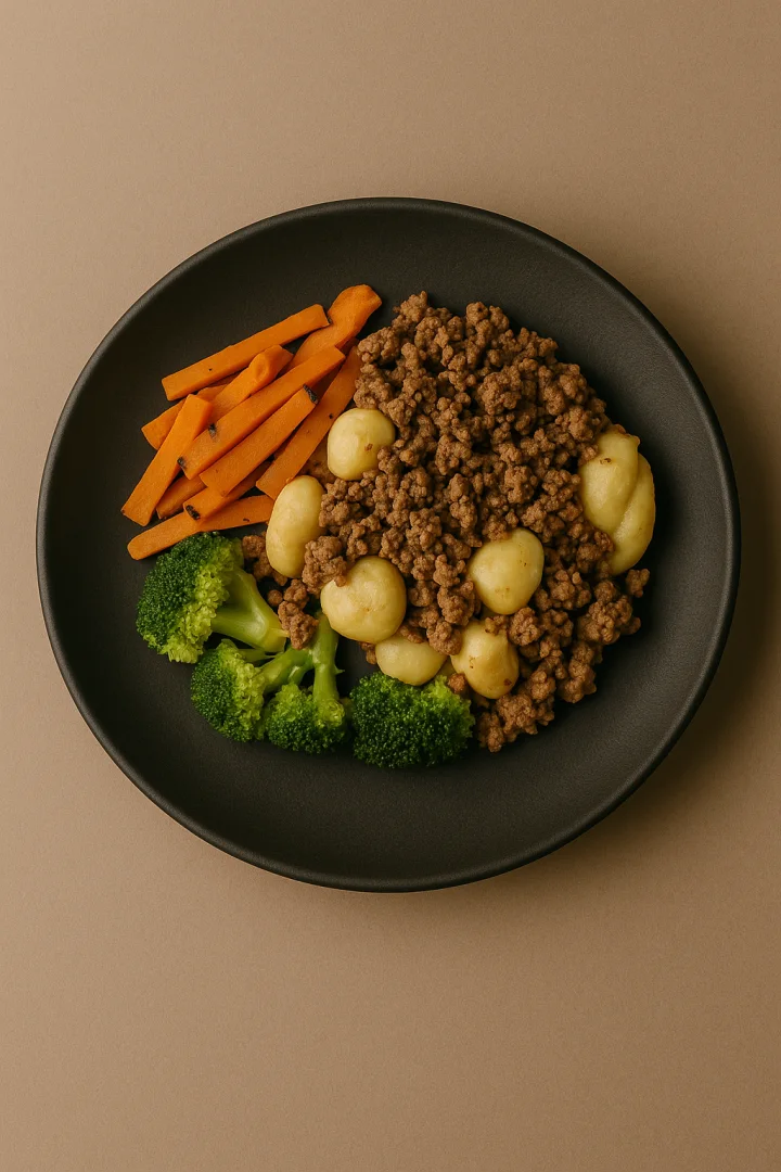 2x H1 - Nhoque de batata-doce à bolonhesa com brócolis e cenouras.