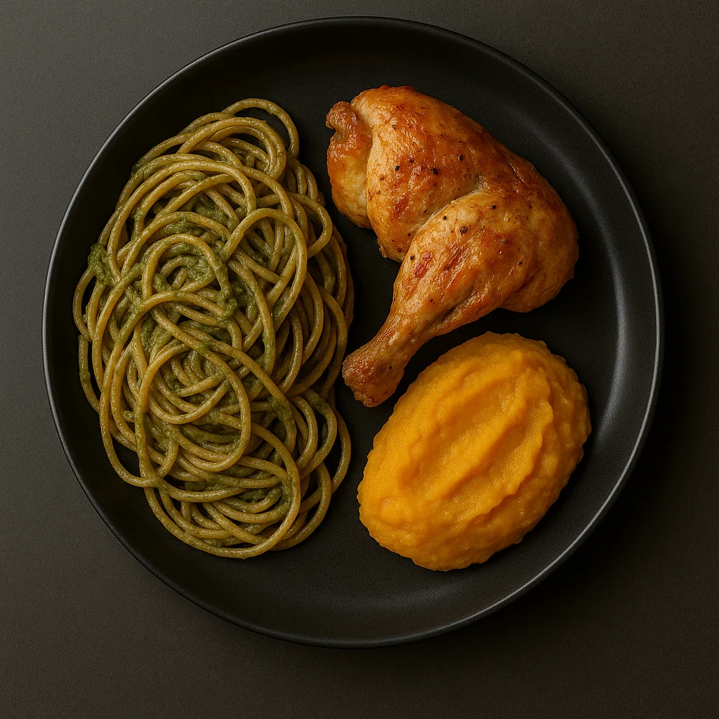 2x L1 - Spaghetti integral ao molho pesto com galeto assado e purê de moranga.
