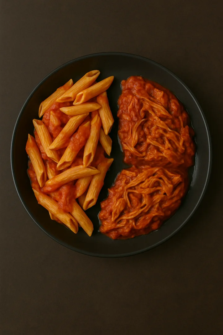 2x P2 - Penne ao molho sugo com peito de frango desfiado.