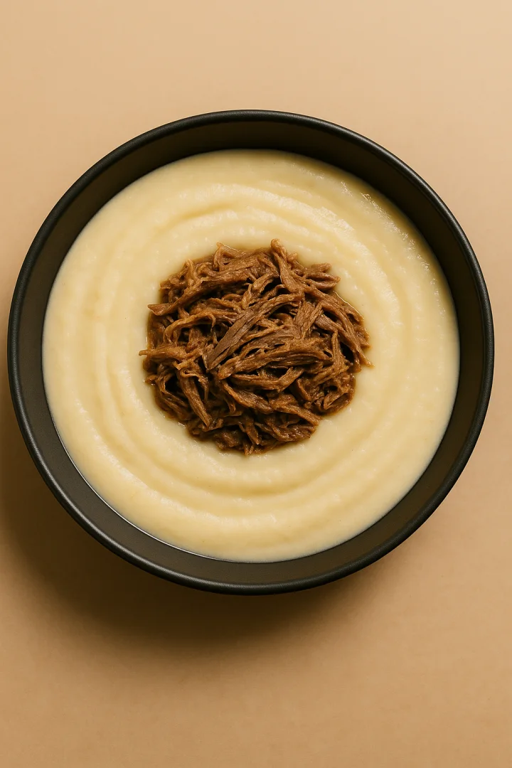 3x C1 - Caldo de batatas com carne de panela desfiada.